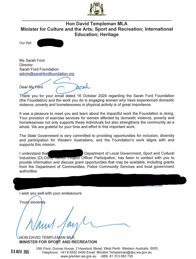 Sarah met with Dr Toni Buti MLA for Armadale and discussed the Sarah Ford Foundation and it’s plan to offer a group fitness service for women who are currently experiencing or who are victim-survivors of family and domestic violence (FDV). Sarah spoke with Dr Buti about plans for upcoming FDV Hub in Armadale and how group exercise could be used as an adjunct treatment alongside more traditional treatment methodologies to assist in reducing the negative symtoms of mental health.